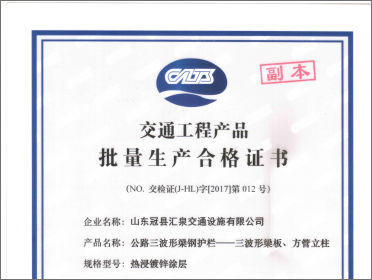 山東冠縣匯泉交通設施有限公司:是以生產高速護欄板,高速公路波形護欄板,高速公路波形梁護欄板、防阻板、托架、防水帽、端頭、法蘭立柱及附屬配件設施為主的企業。發展至今已成為集生產,貿易,開發于一體的綜合型企業。公司注冊資金12000萬。公司位于山東聊城經濟開發區,北靠濟館高速,交通便利,地理位置優越。 公司具有很強的熱鍍鋅、熱鍍鋁;靜電噴塑能力。現有熱鍍鋅生產線2條,同時配備成套的靜電噴塑設備。 公司致力于交通設施的發展,專業大批量生產高頻焊管,護欄板、立柱及相應配件(防阻塊、柱帽、輪廓標、托架、方墊片、防眩板支架、聲屏障、螺栓)。